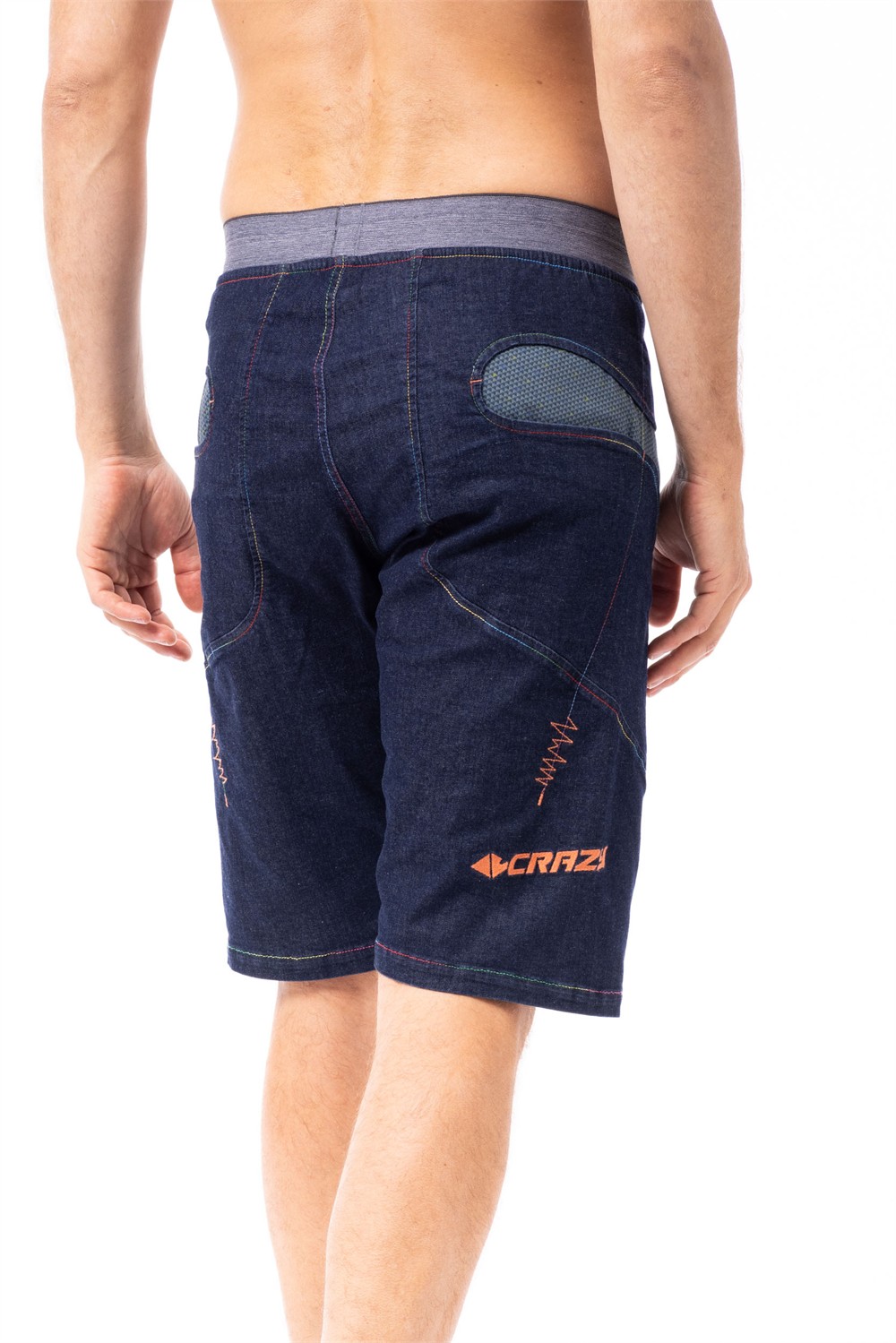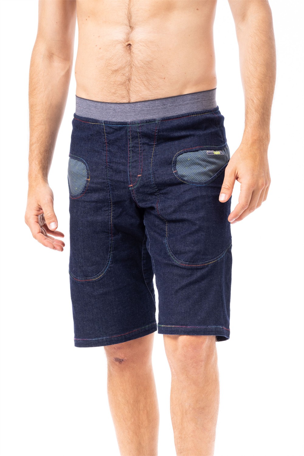 Casual shorts, ideal for climbing and everyday wear, with a unique and colorful style. Made from Performance Cotton or Indigo Jeans, it features a distinctive cargo pocket on the right leg, which is either in a contrasting color or tone-on-tone depending on the variant. The fit is comfortable, enhanced by the waistband and the gusseted cut at the hem, which facilitates movement.