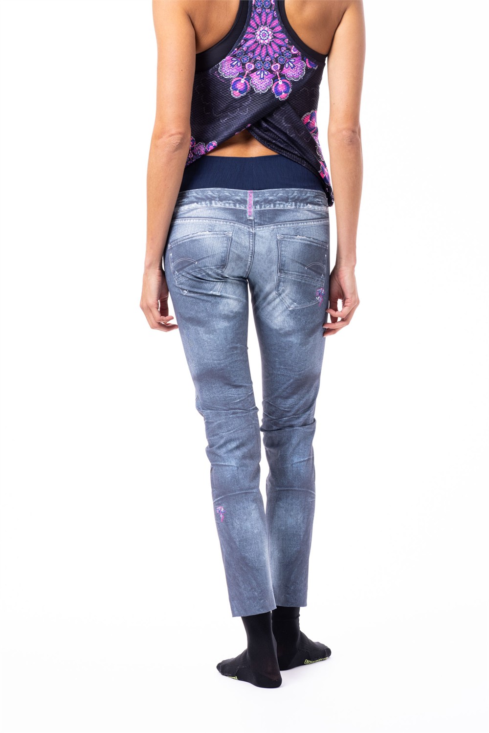 The "jeans that aren’t jeans" of the collection! A unique piece on the market, it stands out for its unmistakable style, perfect for any mountain activity as well as everyday wear. What makes it unique is its craftsmanship: it is made from Revolutional "Made in Italy" fabric, printed to resemble real jeans in various patterns. Each piece is hand-cut to ensure the printed seams align perfectly with the actual seams of the product. The lumbar area is protected with the addition of a comfortable high-waisted elastic band.
