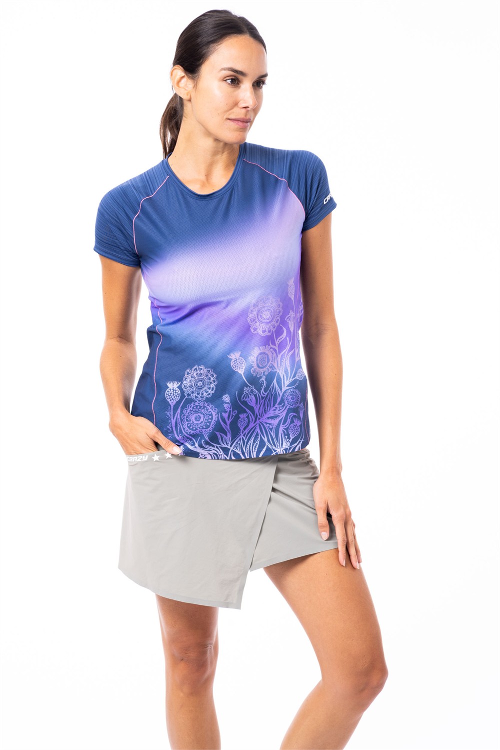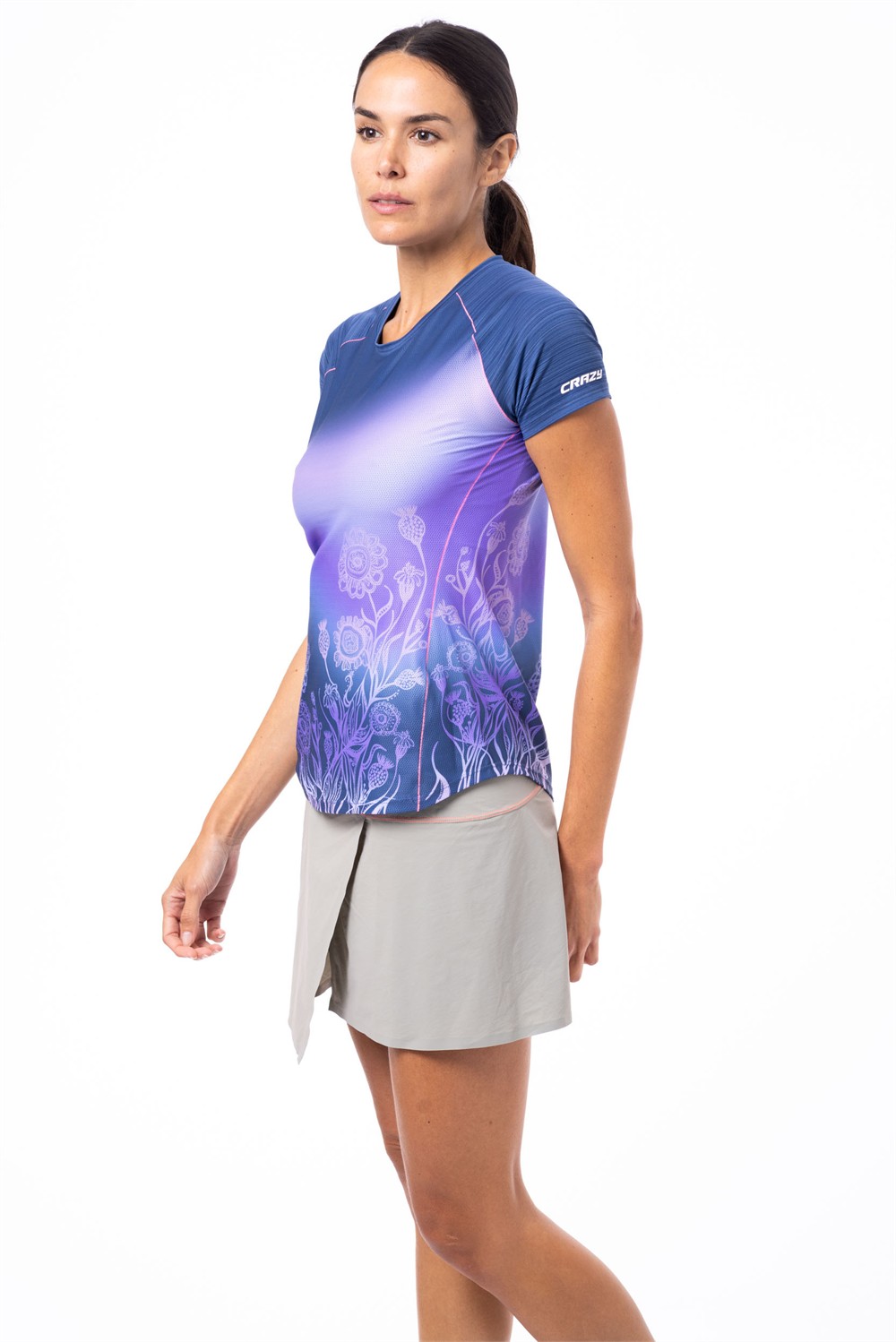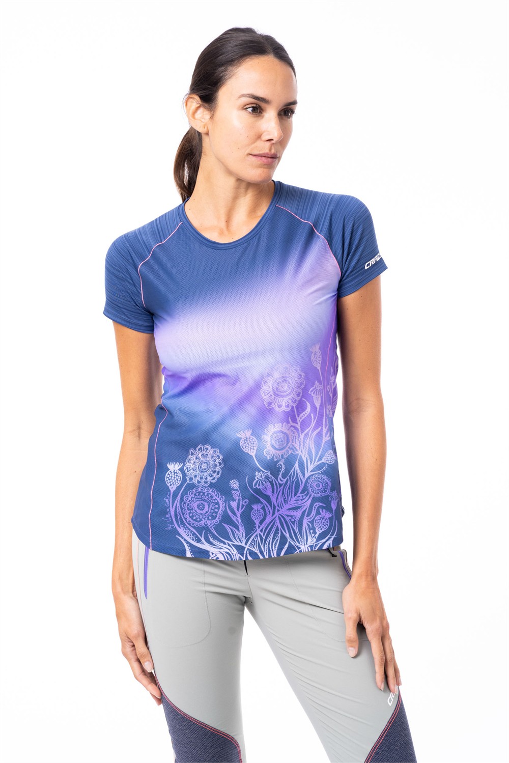 The best-selling T-shirt from the Crazy collection combines technical construction with colorful, bold prints. The printed panels are made using a discontinuous honeycomb-weave polyester, while the sleeves are crafted from lightweight, cool, and quick-drying Coolwave microfiber with a "stripe" pattern. The neck binding is soft and light, suitable for more technical use.