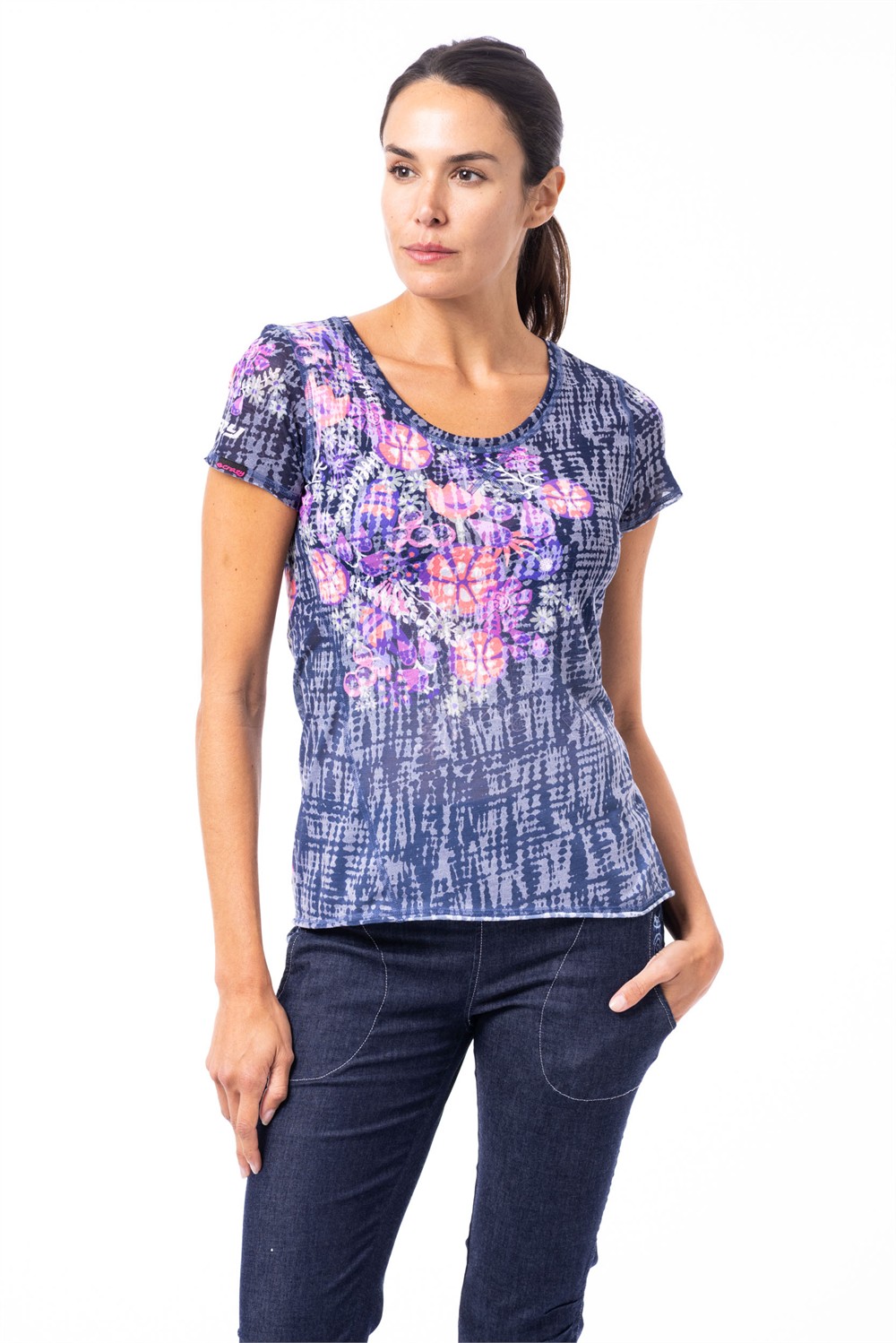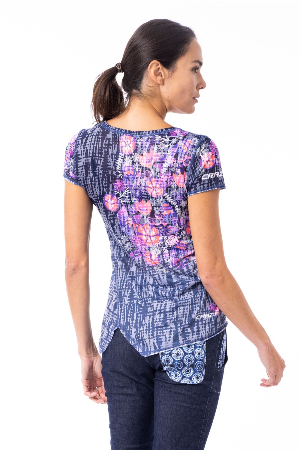 A t-shirt for leisure time? The Aloha T-shirt is perfect! Colorful and fully printed. Made from a cool polyester and viscose fabric with all-over print, it’s ideal for warmer days thanks to the devoré technique, which lightens the fabric. The twist construction with bias-cut and a slit at the back hem gives it an unconventional fit.