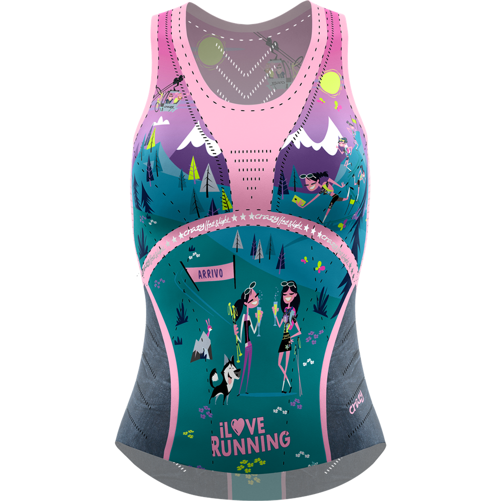 A high-performance, technological running top, developed thanks to our know-how in fitting and our experience in digital printing. It is an innovative item we created by mapping the needs of ventilations of different areas of the body with laser-cut perforations. The straps and the bottom edge are laser cut without hems.