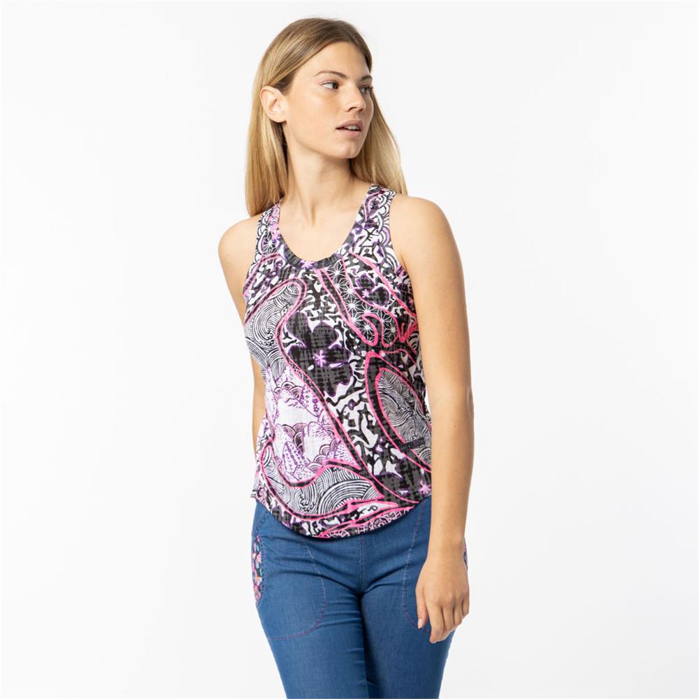 The After Top is the epitome of lifestyle garments! With its vibrant patterns, it's perfect for adding color to leisure activities! Some variations are made with hemp yarn, fresh and natural, while others are crafted with a cool polyester and viscose Devorè fabric. The design features spaghetti straps and a crossed fold at the bottom.