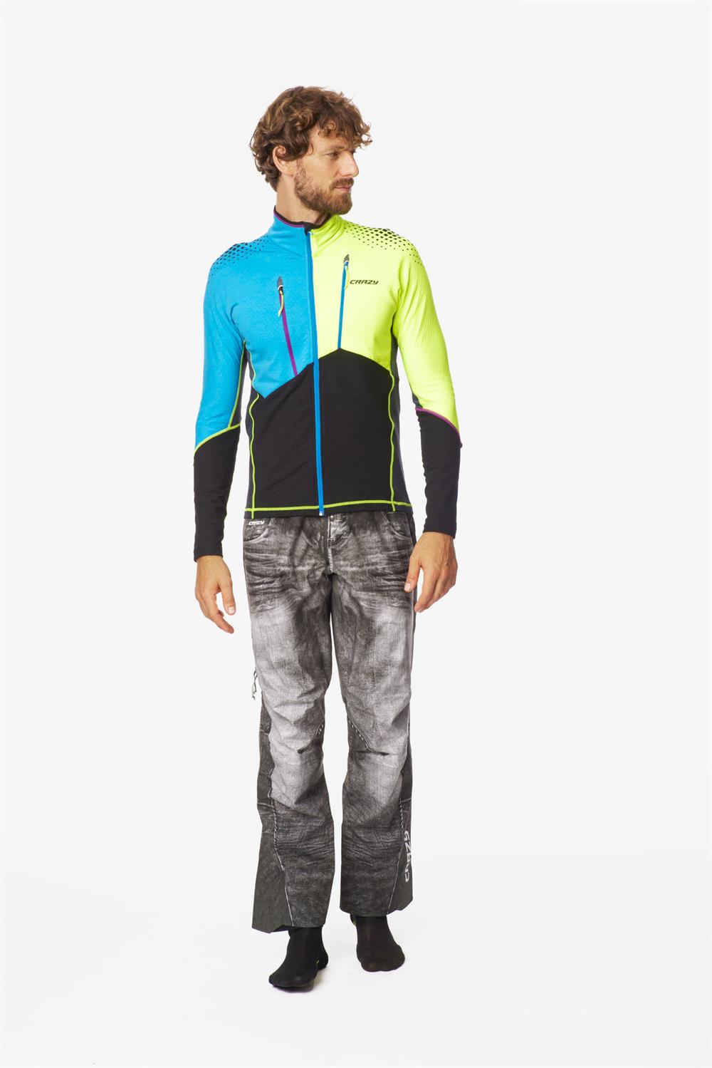 Waterproof trousers for mountaineering, ski mountaineering and ice fall climbing, a real gem in Fast & Light style, featuring a very lightweight bib with minimalist braces that make it quick and easy to wear, comfortable and stable once it is on. We have implemented an innovative fastening system that allows you to keep the braces on even if the trousers are taken off. Definitely the most stretchy, lightweight and packable in the category, designed entirely and pre-shaped for maximum ease of movement. For easy pull-on, the legs feature full-length double-slider side zips - so they can be fully opened. These trousers are constructed with Dermizax Ev, even more durable than the material used for the jacket and come with the iconic denim print. The side pockets can be opened for easy venting. The stretch, reinforced gaiters feature a width adjustment system that makes them easy to wear even over bulky boots or, if fastened, very safe to use with crampons.