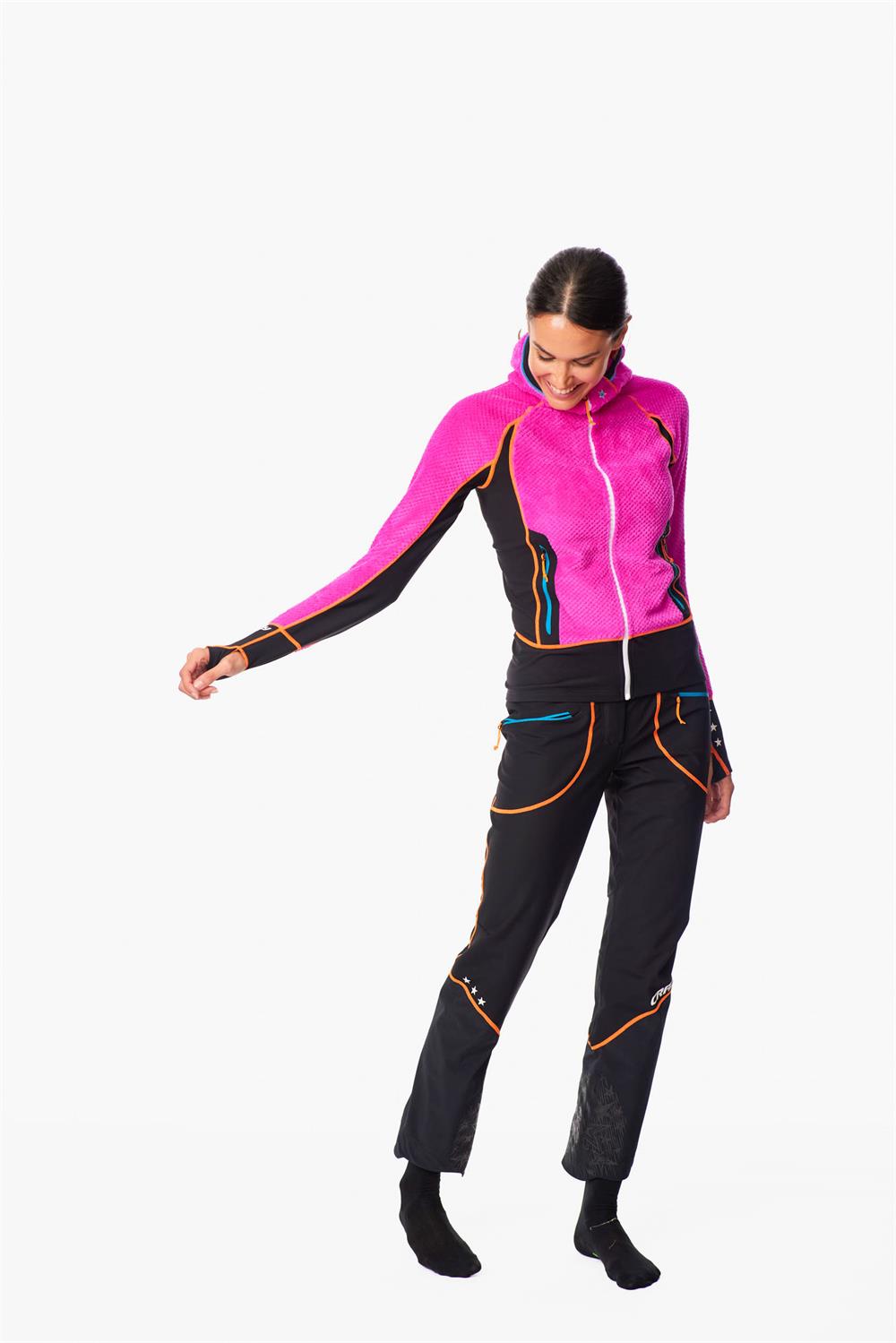 The most technical and complete mountaineering trousers in our collection, this year completely revamped to match the new jacket Inspire. These trousers are ideal for alpine endeavours or ski mountaineering challenges in extreme conditions thanks to the wind protection they provide and their incredible stretch performance. Made from warm soft shell with a highly water-repellent membrane. The waistband can be fully opened and is adjustable via elasticated Velcro straps on the sides. The updated lower legs feature an adjustable ankle gusset with zip and an integrated gaiter for maximum protection against water and snow. They are also equipped with a ‘full-grip’ elastic to hold firmly over most ski-mountaineering boots while, on the inside, they have been reinforced with kick patches against accidental cuts from crampons or ski edges. In addition, the lower legs feature an asymmetric cut, longer on the back, for added style points when worn over boots.