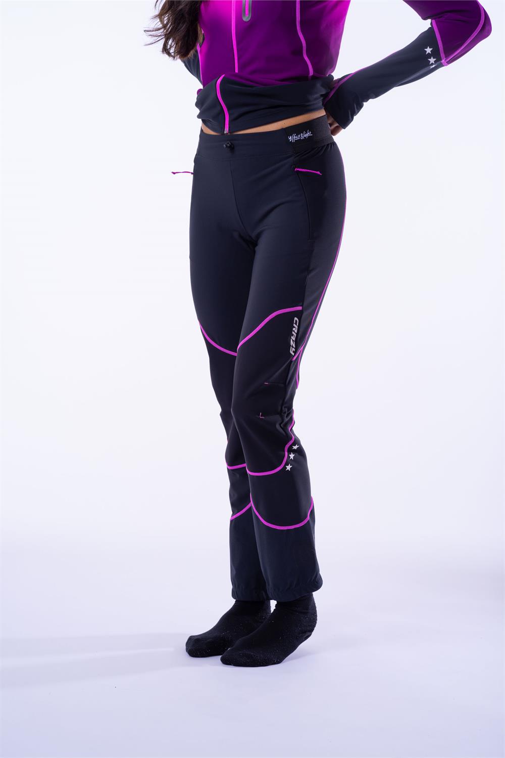 The Oxygen line is designed for training and represents the essence of fast and light in the mountains, combining extremely technical fabrics and advanced constructions with an athletic fit and unique style. Crazy 100%! The pants are made with Vuelta fabric 'Made in Italy,' chosen for its comfort, high breathability, and thermal regulation. The knee inserts are made of soft shell with a windproof membrane for additional protection, and the bottom of the legs features laminated fabric with cut-resistant reinforcement. This garment has an athletic fit and includes technical details such as waterproof gaiters with full-grip elastic that adapt to ski mountaineering boots.