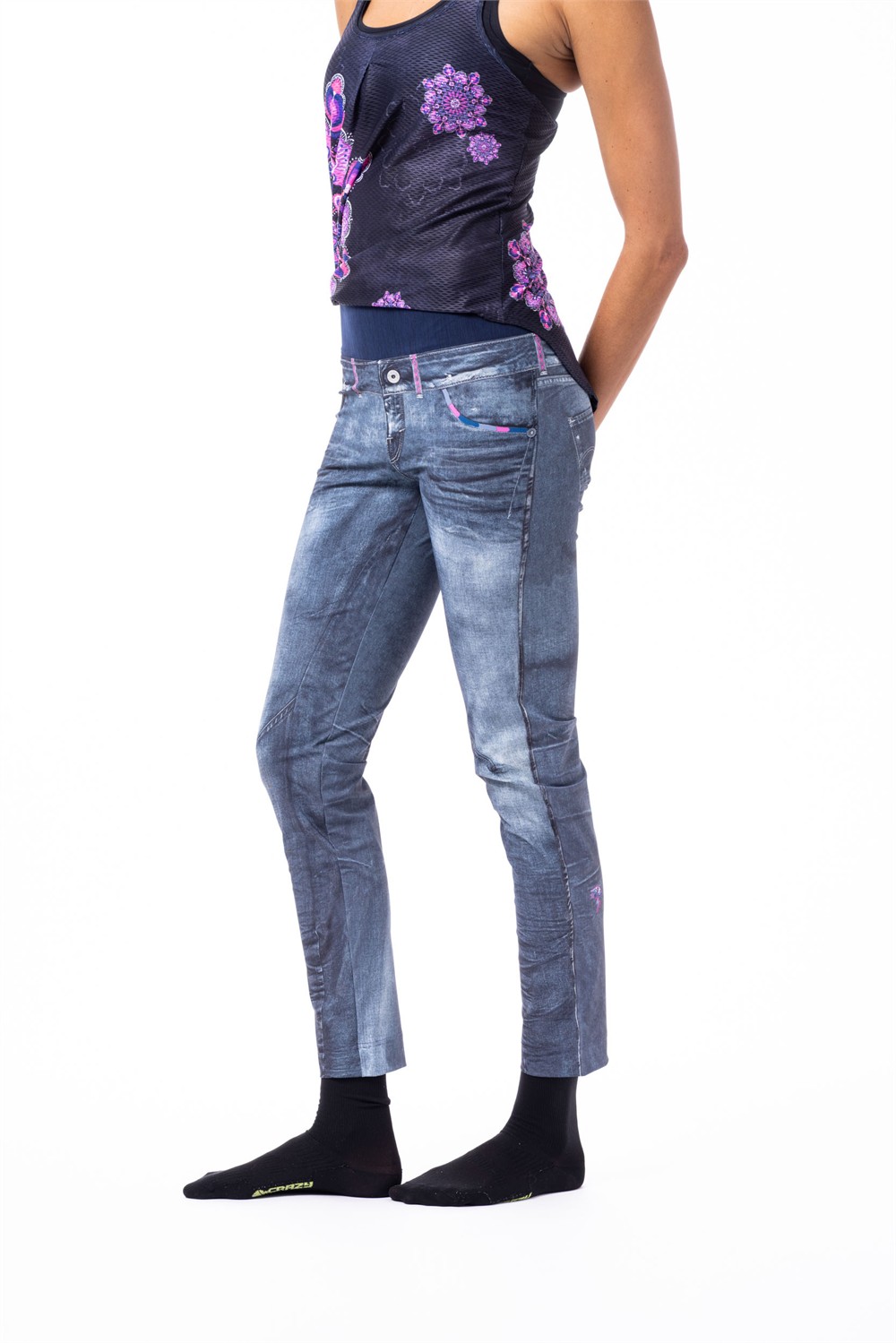 The "jeans that aren’t jeans" of the collection! A unique piece on the market, it stands out for its unmistakable style, perfect for any mountain activity as well as everyday wear. What makes it unique is its craftsmanship: it is made from Revolutional "Made in Italy" fabric, printed to resemble real jeans in various patterns. Each piece is hand-cut to ensure the printed seams align perfectly with the actual seams of the product. The lumbar area is protected with the addition of a comfortable high-waisted elastic band.