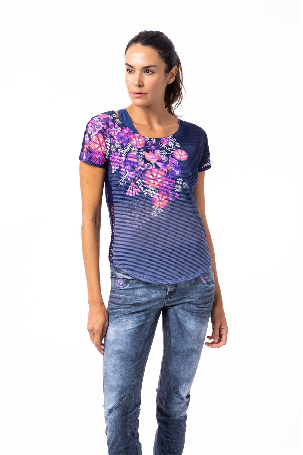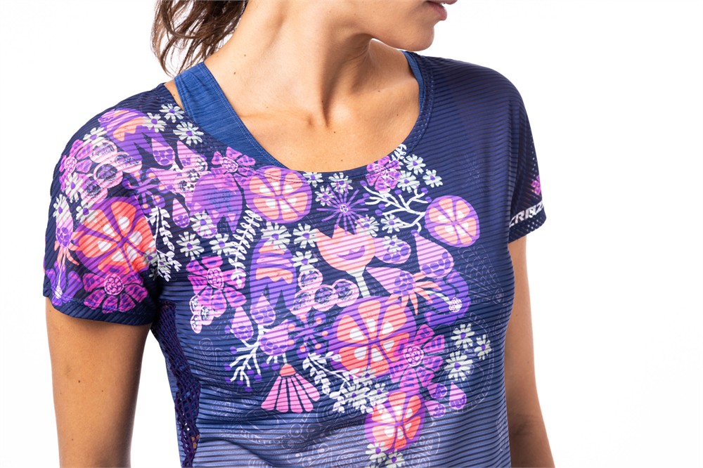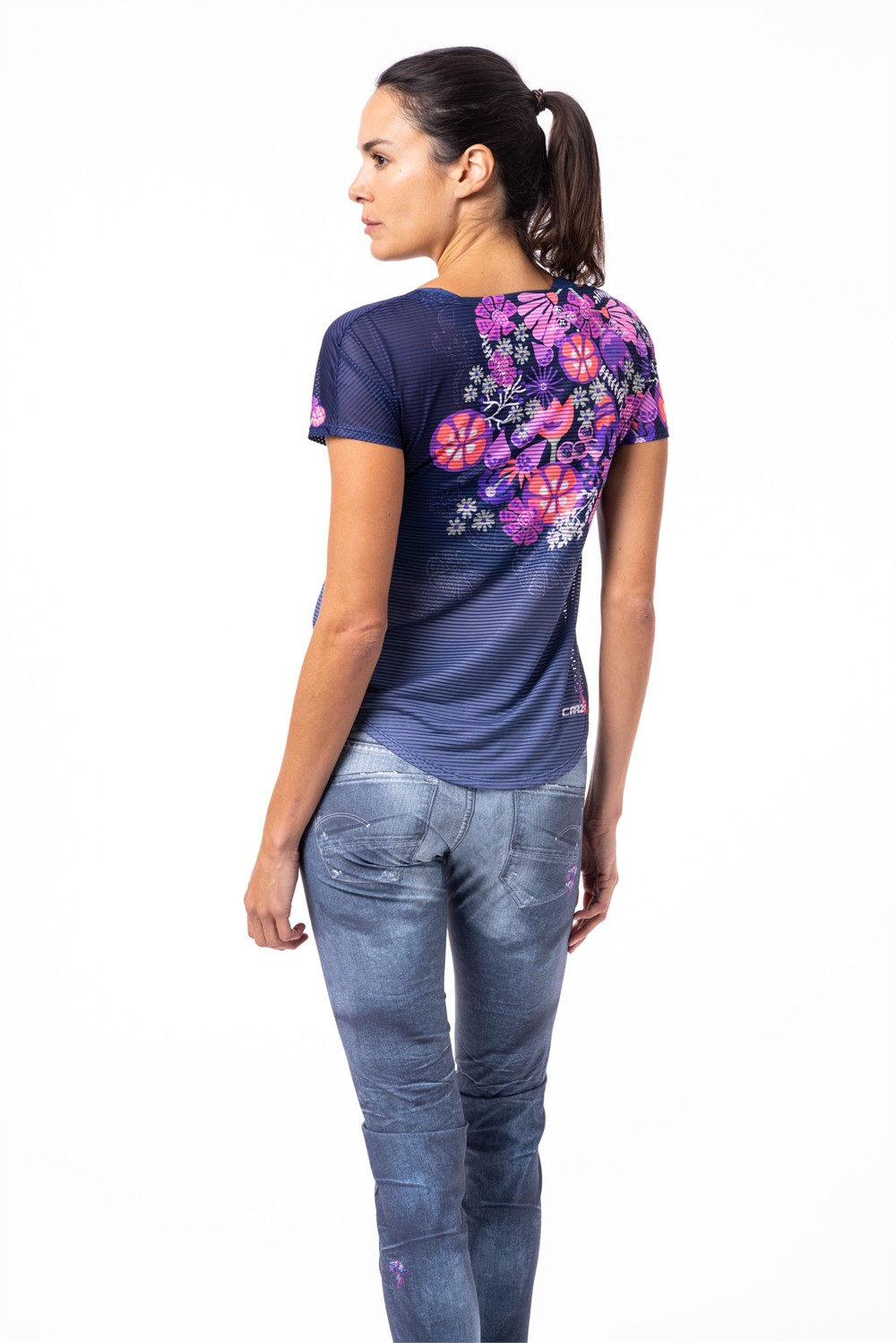 Modern T-shirt with removable internal bra. It stands out on the hottest days thanks to the Hydro Cool fabric, incredibly breathable and lightweight with a slatted weave, and the mesh side panels. The internal bra is made of quick-drying microfiber and is removable with a simple snap button.